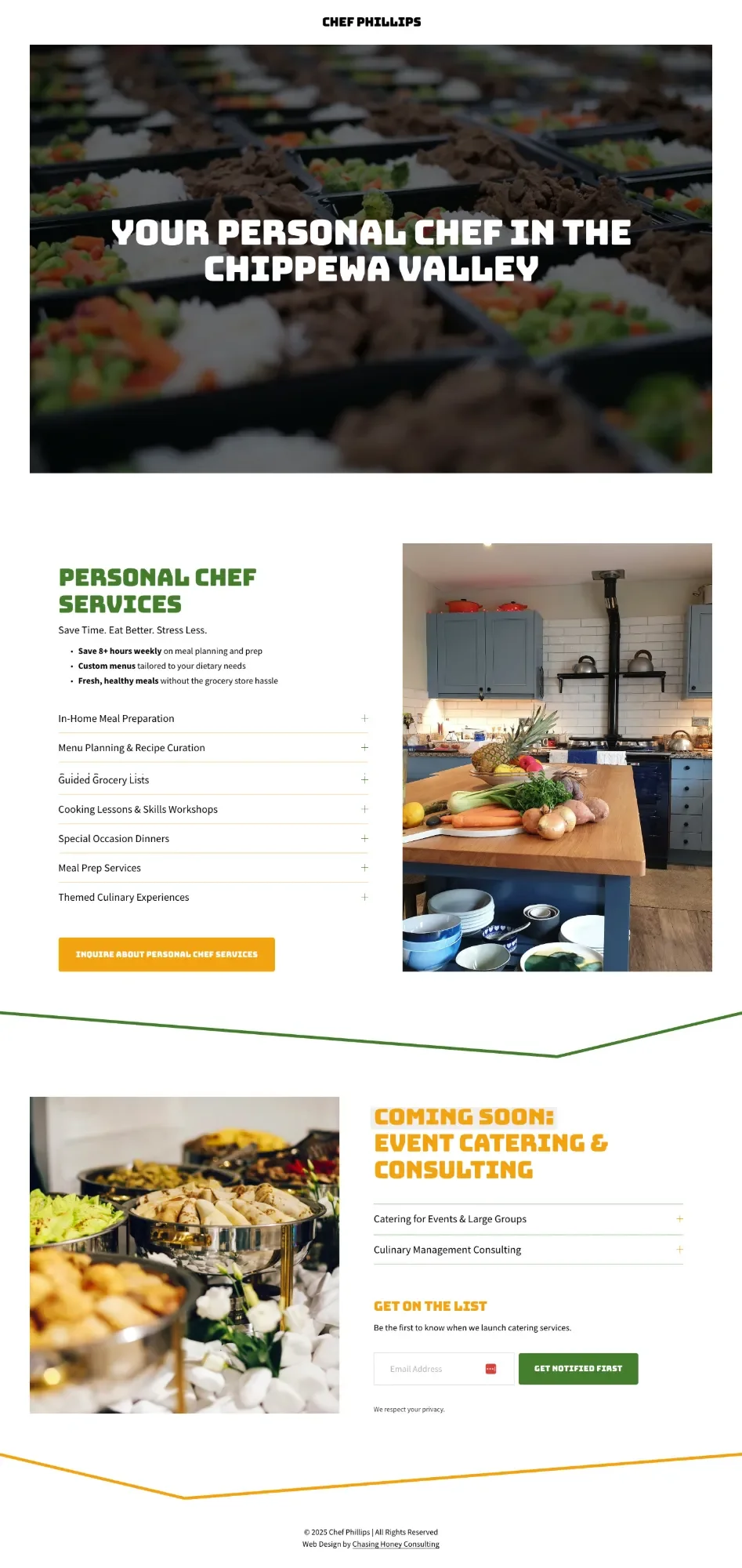 Digital store-front for an up-and-coming personal chef to display his services and build a client list.